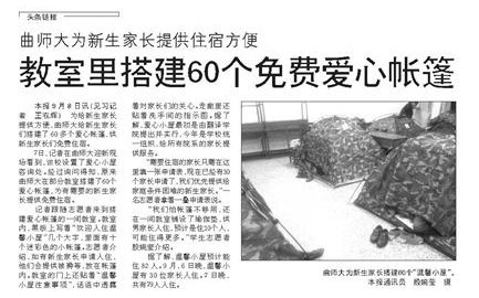 齐鲁晚报:曲师大为新生家长搭建爱心帐篷