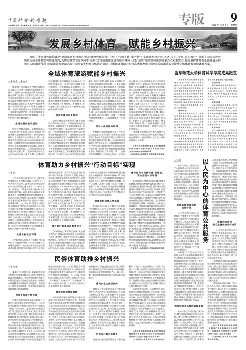 曲阜师大体育科学学院讯 日前,中国社会科学报在“发展乡村体育、赋能乡村振兴”专版中刊登了开云手机入口山东省乡村振兴体育研究院执行副院长曹莉教授团队的系列成果,其内容包括:体育助力乡村振兴“行动目标”、构建以人民为中心的体育公共服务、全域体育旅游赋能乡村振兴、民俗体育助推乡村振兴等主题的阶段性战略研究。报道还对学校体育科学学院近年来取得的相关成绩进行了列举,相关科研成果为全国农村体育发展提供理论依据和现实借鉴,标志着团队的研究在乡村体育领域处于省内领先地位、对全国乡村体育研究形成较大影响。