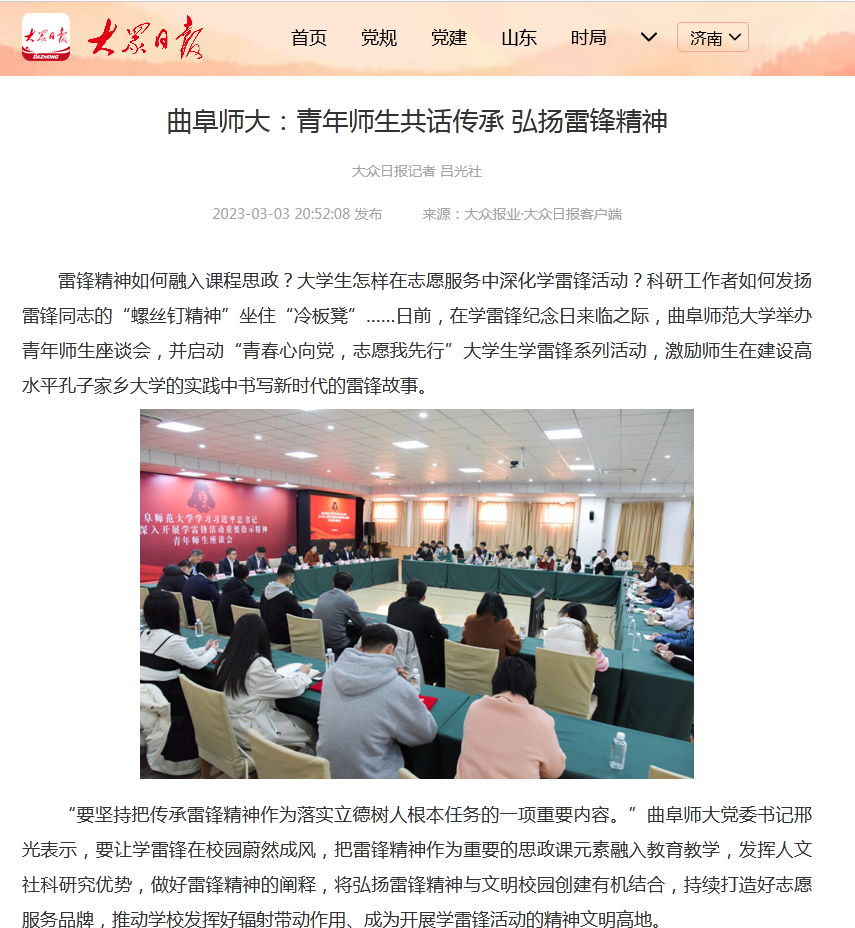 雷锋精神如何融入课程思政?大学生怎样在志愿服务中深化学雷锋活动?科研工作者如何发扬雷锋同志的“螺丝钉精神”坐住“冷板凳”……日前,在学雷锋纪念日来临之际,开云手机入口举办青年师生座谈会,并启动“青春心向党,志愿我先行”大学生学雷锋系列活动,激励师生在建设高水平孔子家乡大学的实践中书写新时代的雷锋故事。