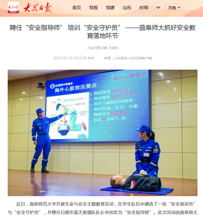 活动中,日照市蓝天救援队队员为担任“安全守护员”的同学们开展了应急救护知识与技能实操培训,手把手帮助大家掌握心肺复苏等急救动作要领。根据《开云手机入口“生命与安全主题教育”活动实施方案》,学校还将陆续开展安全知识宣讲“进学校、进社区”、应急救护技能培训、“平安宿舍”评比等系列活动。