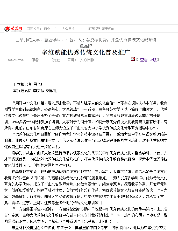 设学孔子故里,曲师大始终坚持传承以儒家文化为代表的中华优秀传统文化,整合学科、平台、人才等资源优势,多维赋能优秀传统文化普及推广,打造优秀传统文化教育特色品牌,探索中华优秀传统文化创造性转化、创新性发展的生动实践。
