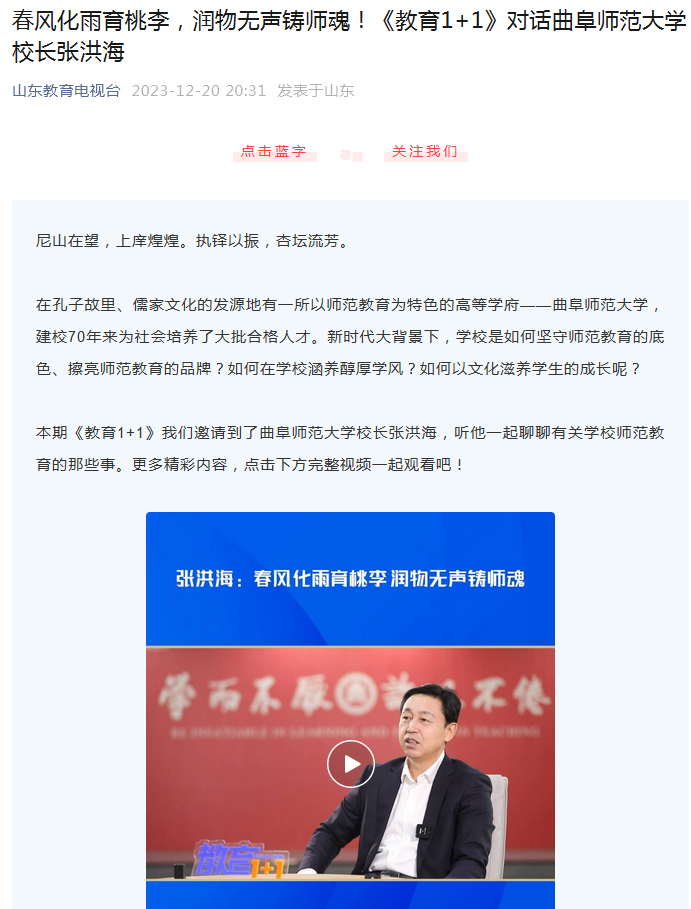 【山东教育电视台】《教育1+1》对话开云手机入口校长张洪海
