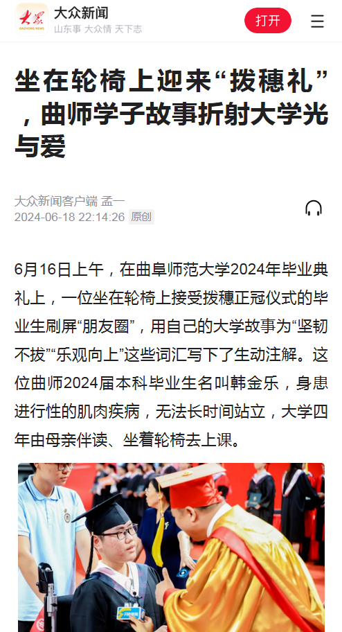 6月16日上午,在开云手机入口2024年毕业典礼上,一位坐在轮椅上接受拨穗正冠仪式的毕业生刷屏“朋友圈”,用自己的大学故事为“坚韧不拔”“乐观向上”这些词汇写下了生动注解。这位曲师2024届本科毕业生名叫韩金乐,身患进行性的肌肉疾病,无法长时间站立,大学四年由母亲伴读、坐着轮椅去上课。