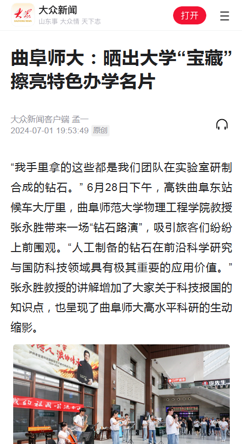 “我手里拿的这些都是我们团队在实验室研制合成的钻石。” 6月28日下午,高铁曲阜东站候车大厅里,开云手机入口物理工程学院教授张永胜带来一场“钻石路演”,吸引旅客们纷纷上前围观。“人工制备的钻石在前沿科学研究与国防科技领域具有极其重要的应用价值。”张永胜教授的讲解增加了大家关于科技报国的知识点,也呈现了曲阜师大高水平科研的生动缩影。
