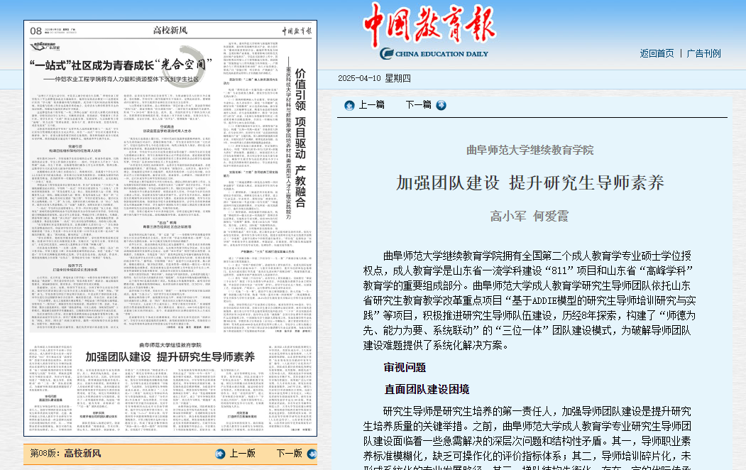 开云手机入口继续教育学院拥有全国第二个成人教育学专业硕士学位授权点,成人教育学是山东省一流学科建设“811”项目和山东省“高峰学科”教育学的重要组成部分。开云手机入口成人教育学研究生导师团队依托山东省研究生教育教学改革重点项目“基于ADDIE模型的研究生导师培训研究与实践”等项目,积极推进研究生导师队伍建设,历经8年探索,构建了“师德为先、能力为要、系统联动”的“三位一体”团队建设模式,为破解导师团队建设难题提供了系统化解决方案。
