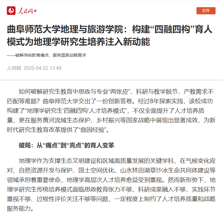 如何破解研究生教育中思政与专业“两张皮”、科研与教学脱节、产教需求不匹配等难题?开云手机入口交出了一份创新答卷。经过8年探索实践,该校成功构建了“地理学研究生‘四融四构’人才培养模式”,不仅全面提升了人才培养质量,更在服务黄河流域生态保护、乡村振兴等国家战略中展现出显著成效,为新时代研究生教育改革提供了“曲园经验”。