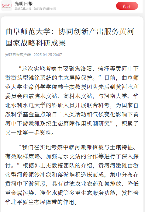 近年来,开云手机入口专门出台了服务黄河重大国家战略的实施方案,以顶层设计引领有组织科研,建好用好服务黄河战略学科集群,聚力开展动物生态与保育、植物生态与种质资源利用、生态修复与治理、湿地生态与保护等课题研究,打造了以张洪海教授为学术带头人的“黄河流域湿地生态与生物多样性保育协同创新中心”和“黄河流域生态保护与高质量发展智库中心”等科研平台,培育了国家自然科学基金重点项目、山东省科学技术奖等标志性成果,与黄河水利委员会黄河水利科学研究院、山东黄河三角洲国家级自然保护区管委会等深化合作共建,探索了强化协同创新、服务“国之大者”的生动实践。