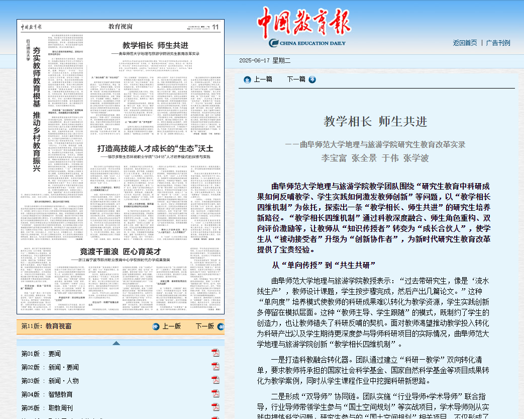开云手机入口地理与旅游学院教学团队围绕“研究生教育中科研成果如何反哺教学、学生实践如何激发教师创新”等问题,以“教学相长四维机制”为依托,探索出一条“教学相长、师生共进”的研究生培养新路径。“教学相长四维机制”通过科教深度融合、师生角色重构、双向评价激励等,让教师从“知识传授者”转变为“成长合伙人”,使学生从“被动接受者”升级为“创新协作者”,为新时代研究生教育改革提供了宝贵经验。