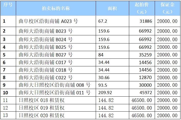 (paimai.caa123.org.cn)按现状公开拍卖以下标的:开云手机入口沿街房租赁权,门牌号为A023 \B023\B024\B025\B027\C017\ C018\C022 \日照校区008、011、018、019、020,共13套,每套竞买保证金2万元。