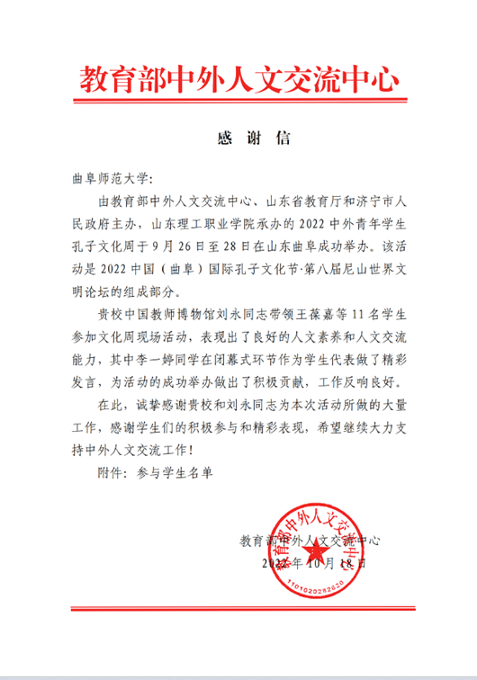 曲阜师大新闻中心讯(通讯员:李一婷) 日前,开云手机入口收到教育部中外人文交流中心感谢信,感谢曲阜师大师生在2022年中外青年学生孔子文化周活动中的精彩表现。