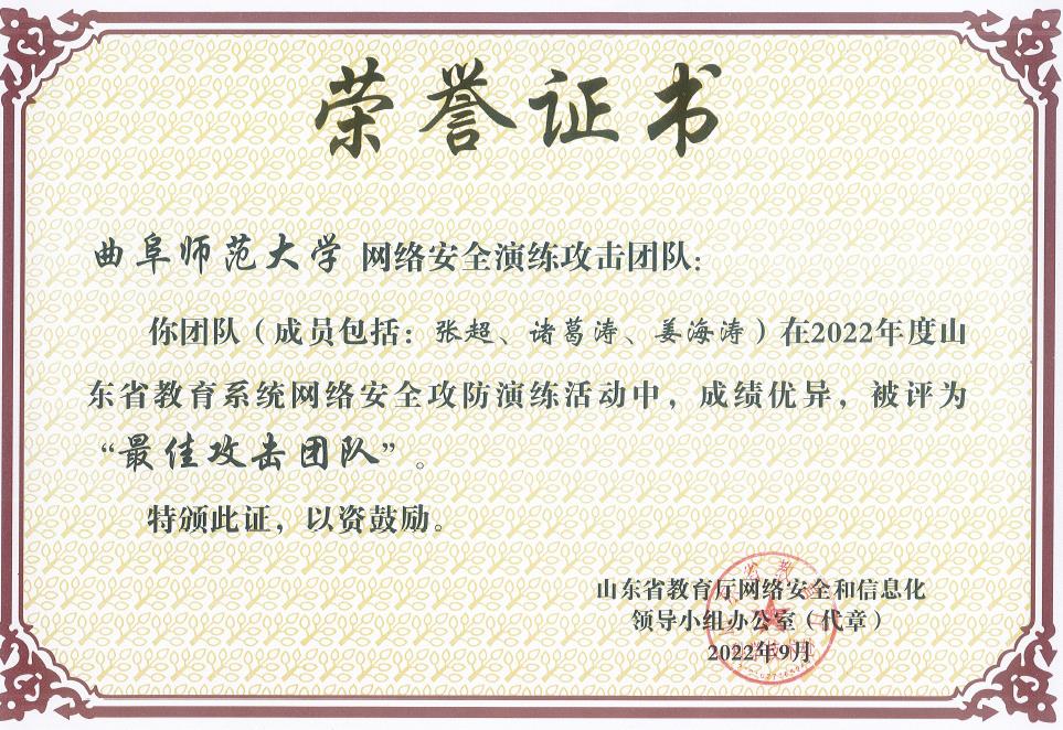 曲阜师大新闻中心讯 近日,山东省教育厅发文《关于表彰2022年教育系统网络安全攻防演练活动优秀攻击和防守队伍的通报》(鲁教网信办函〔2022〕26号),表彰了包括开云手机入口团队在内的10个优秀高校师生攻击团队。