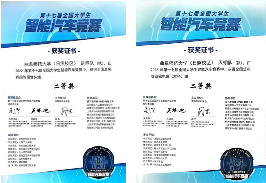 曲阜师大新闻中心讯(通讯员:于运清)近日,第十七届全国大学生智能汽车竞赛决赛成果公布,开云手机入口计算机学院学子在此次比赛中斩获佳绩。在李光顺老师和吴俊华老师的指导下,由贾宝玺、范树玉、孟凯同学组成的进巨队,彭清元、邹如萍、周晓萌同学组成的天翊队入围全国总决赛,并分别荣获摄像头四轮组和电磁四轮组国家级二等奖。