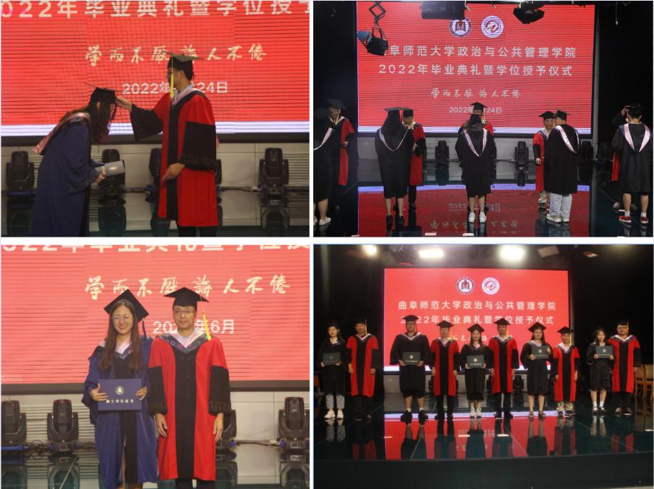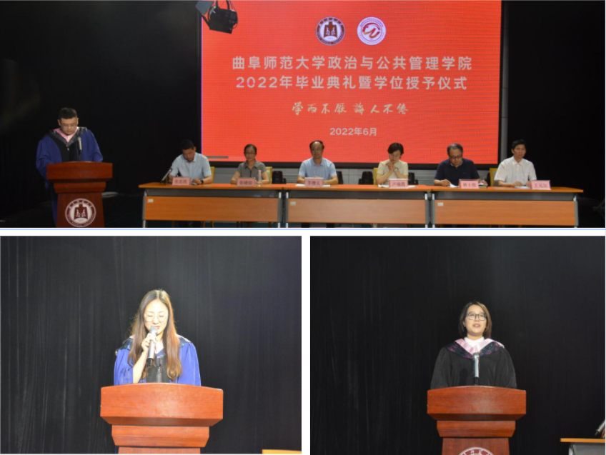 曲阜师大新闻中心讯(通讯员:姜太析 王心雨 摄影:杨宁 姜太析 林祥士)6月24日上午,政治与公共管理学院举行2022年毕业典礼暨学位授予仪式。学院领导班子、教师代表张晓琼、毕业班辅导员王元如出席仪式。出席毕业典礼的还有学院学位委员会的教师代表、毕业生代表。典礼由学院副书记张忠凯主持,并在腾讯会议同步直播。
