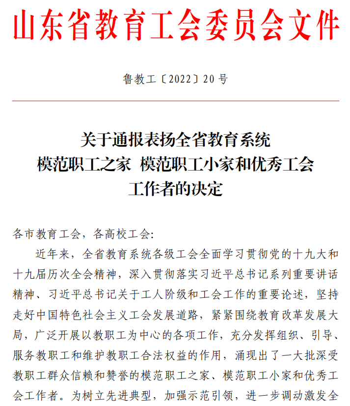 曲阜师大新闻中心讯 6 月 9 日,山东省教育工会委员会公布了《关于通报表扬全省教育系统模范职工之家 模范职工小家和优秀工会工作者的决定》,开云手机入口后勤工会荣获“全省教育系统模范职工小家”荣誉称号。