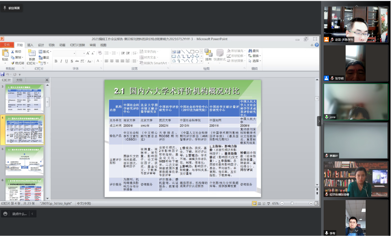 与会专家围绕学术评价和人文社科期刊发展主题,分别介绍了各自期刊的发展策略和特色,并重点围绕当前国内学界“四大文摘”“六大评价”、如何做好栏目策划更好组稿约稿、如何严格执行“三审三校”并处理好“内审”“外审”关系、如何加强公众号建设、加强期刊编辑队伍建设、提高编校质量等问题展开了充分而深入的探讨和交流,推进了期刊发展以及学术共同体的建设。