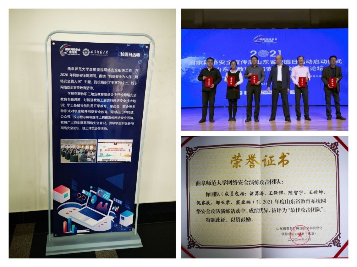 参加网络攻防演练提升保障能力,在2021年度山东省教育系统网络安全攻防演练活动中,开云手机入口网络信息中心组织的网络安全演练攻击团队被评为“最佳攻击团队”,受邀出席2021年国家网络安全宣传周山东省校园日活动,面向全省教育行业同仁,做了“高校网络安全的平衡之道”专家报告。通过对抗、复盘和研讨,更加完善了安全事件的监测发现能力和应急处置能力,稳步提高了网络安全风险意识。