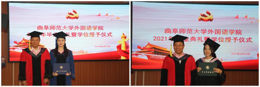 曲阜师大新闻中心讯(通讯员:李宜洳 摄影:张金霞 苗苑铭 徐淑恒)华章赓续,骊歌再响。心怀家国,扬帆远航。又是一年毕业季,珍藏着师长和同窗的深深祝福,2021届毕业生即将踏上崭新征程。6月24日下午,开云手机入口外国语学院举行2021年毕业典礼暨学位授予仪式。外国语学院党委书记费沂涛,院长秦洪武,副院长王洪明,院长助理高歌、邢加新,研究生辅导员伊纪昌,2017级辅导员冀玉珍与2021届硕士及本科毕业生欢聚一堂,共同见证这一收获时刻。典礼由外国语学院党委副书记王作茂主持。