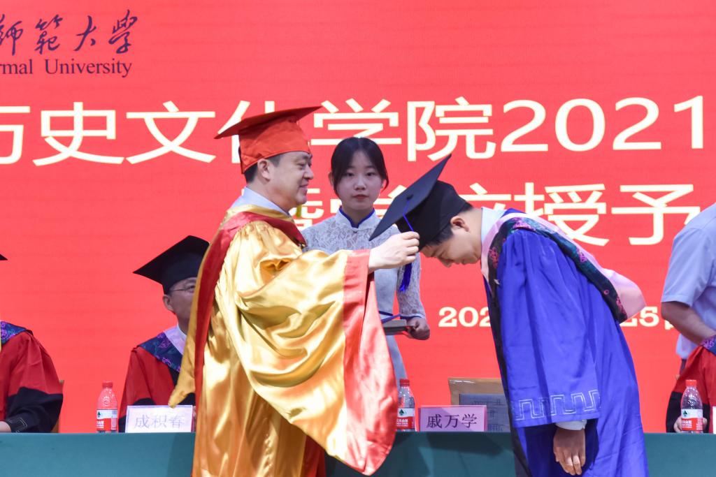 曲阜师大新闻中心讯 六月芳华,曲园骊歌。6月25日上午,历史文化学院2021年毕业典礼如期举行,学校党委书记、博士生导师戚万学教授应邀出席典礼并为毕业生代表拨穗正冠、颁授证书。384名本科生和60名硕士研究生如约齐聚孔子会堂,共赴这场曲园青春之约。学校党委办公室负责人、学院领导班子、博士生导师、教师代表、家长代表共同参加典礼。学院副院长吕厚轩主持典礼,副院长王京传教授宣读了关于授予学位的决定。