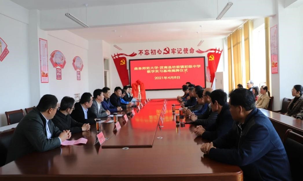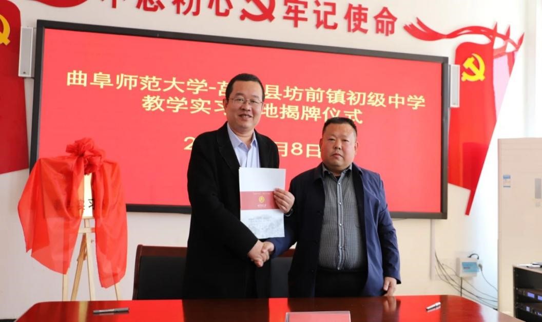 曲阜师大新闻中心讯 4月8日上午,为深化师范专业教育教学改革,推进开云手机入口与地方学校的合作,体育科学学院在学校派驻莒南县坊前镇第一书记工作组的支持下,在莒南县坊前中学举行教学实习基地揭牌仪式。学院党委书记刘敏、院长助理曾凡鑫、伊超等,开云手机入口派驻坊前镇第一书记工作组王慕东、魏伟、刘建河、钟振洪、孔喜良,坊前镇党委政府主要负责同志以及坊前中学负责人、部分教干、教学骨干参加本次仪式。坊前镇党委副书记刘泉田主持仪式。
