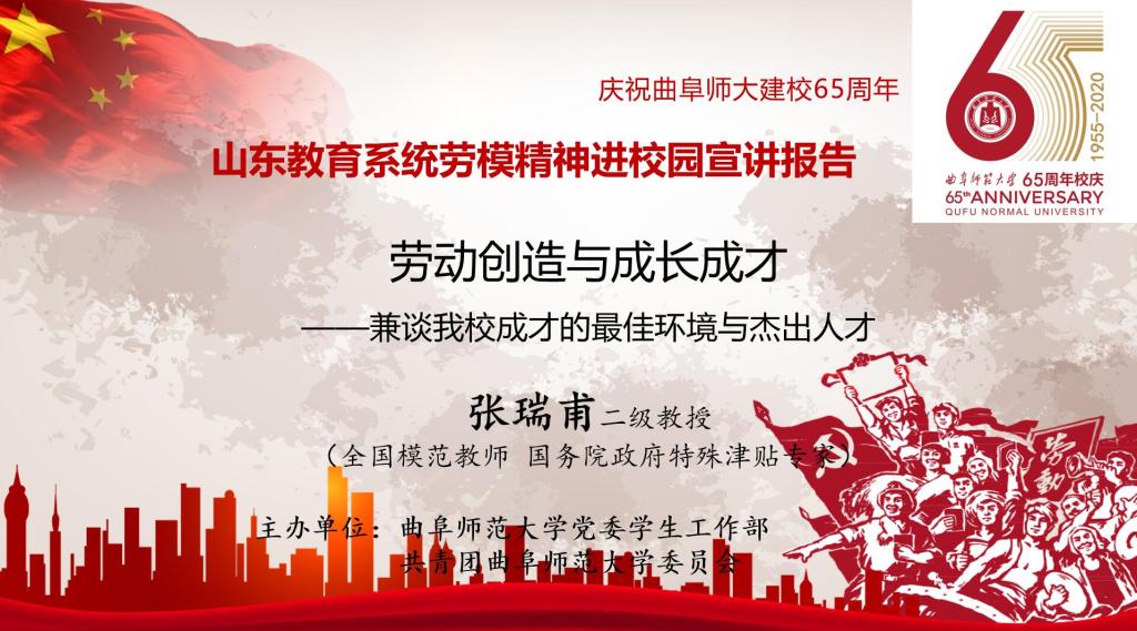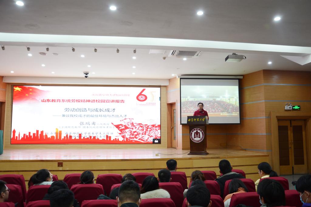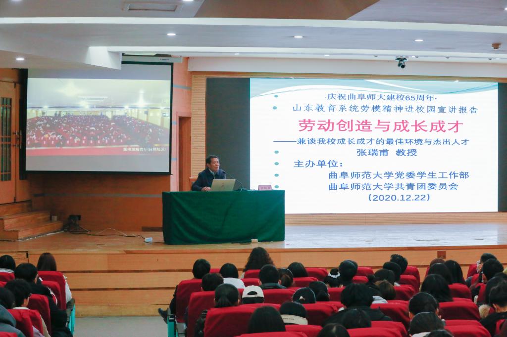 曲阜师大新闻中心讯(通讯员:曹亚楠 尹斌)在校庆65周年之际,为深入学习贯彻习近平总书记在今年“全国劳动模范和先进工作者表彰大会”上的重要讲话精神,以及中共中央、国务院《关于全面加强新时代大中小学劳动教育的意见》、教育部《大中小学劳动教育指导纲要(试行)》文件精神, 12月22日,学生工作部、校团委邀请受到习近平总书记接见的全国模范教师、国务院政府特殊津贴专家、山东教育系统劳模精神进校园宣讲团成员张瑞甫教授,作了题为“劳动创造与成长成才”的报告。报告会由校团委书记宋国栋主持,全校辅导员、“青马工程”学员代表和宿舍舍长代表参加了报告会。