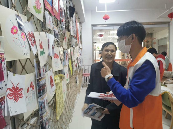 表演结束后,在负责人的带领下队员们来到老人们居住的地方,送上自己手写的祝福卡片,并与老人们聊天谈心。大家在倾听与分享中了解到过去生活的艰辛和当今生活的来之不易,体会和理解老人们的心理,意识到敬老院志愿服务并不是一时兴起,而是日朝日夕的工程。