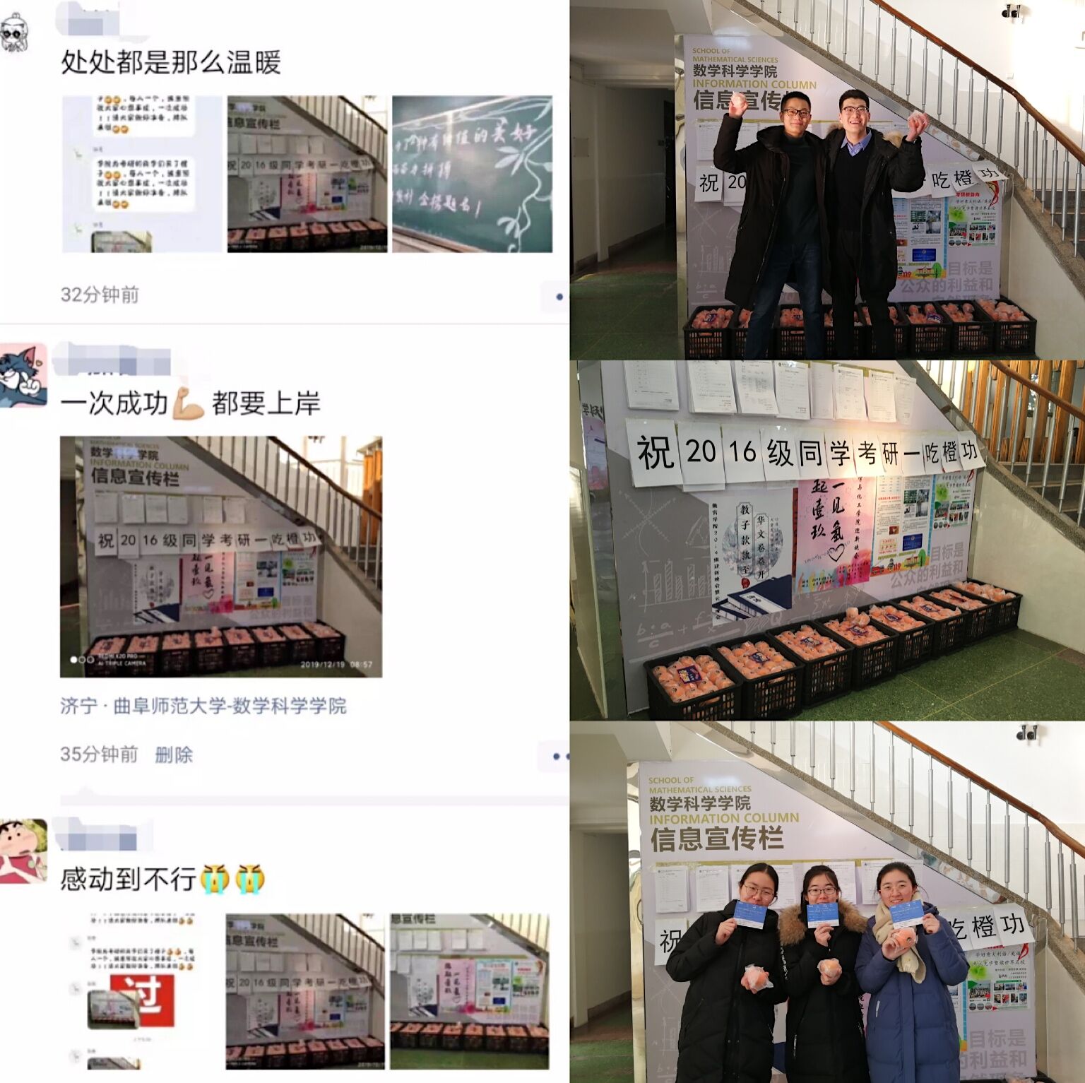12月19日早上,在数学科学学院党委副书记曲凤东的带领下,辅导员老师们为2016级考研学生发放新鲜的橙子,预祝考研学子心想事“橙”,一吃“橙”功。