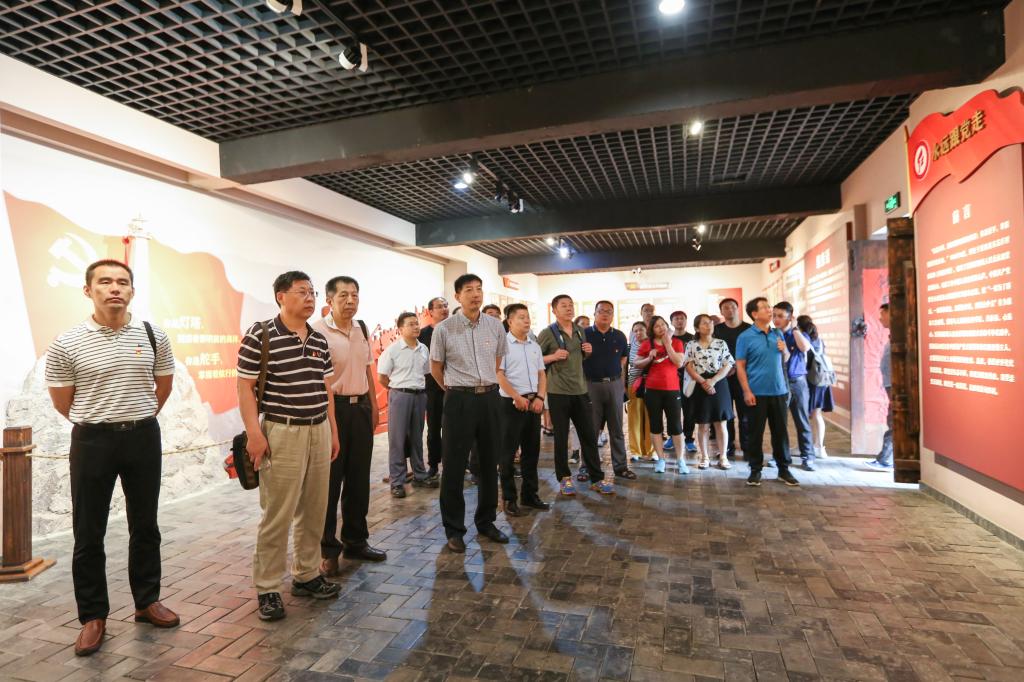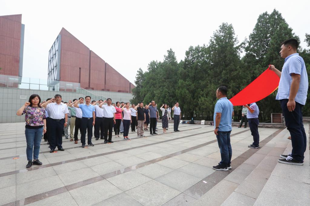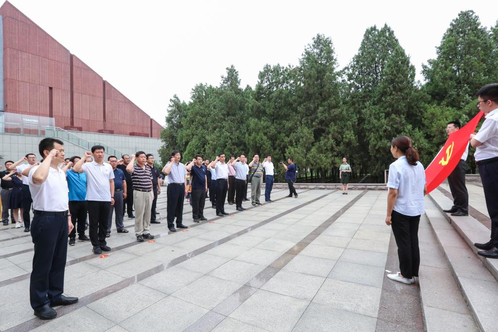 参观完展览室后,大家静静地来到烈士墓地。在镌刻有2800多名烈士姓名的烈士英名塔前,大家整齐肃立,面对鲜红的党旗,举起右拳,重温入党誓词,发出铮铮誓言。铿锵有力的誓言在空中回荡,既是对烈士英魂的告慰,更是对初心使命的牢记。