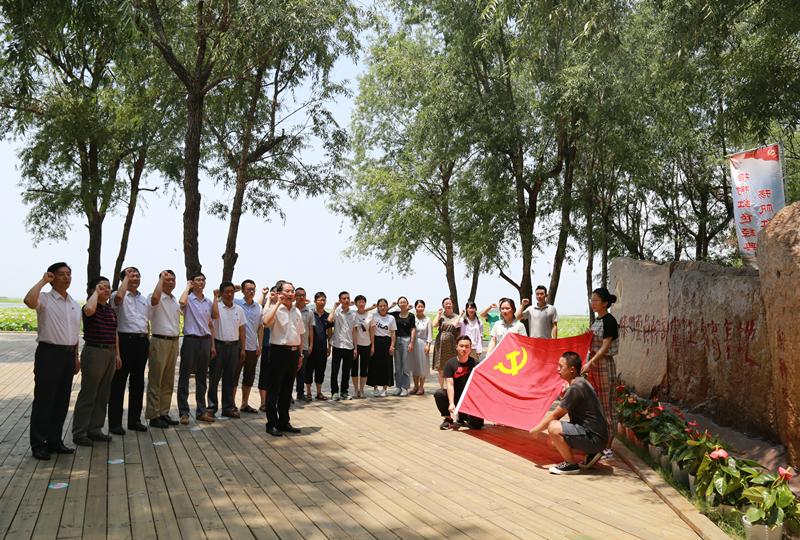 7月1日,全体党员前往山东省委党校教研基地——位于微山湖上的滕州党员干部党性教育基地进开展主题党日现场教学活动。当年,微山湖是山东通向延安的秘密交通线,鲁南的铁道游击队、微湖大队、运河支队等党领导下的地方武装密切配合,给日本侵略者以沉重打击。师生一路瞻仰了护送刘少奇过湖的十柳渡广场、怀念先烈的致敬树和陈毅元帅1943年途径微山湖的咏湖阁,在为纪念铁道游击队第二任政委文立正烈士而修建的千秋亭凭吊革命先烈,随后到达山东党性教育基地——胜利之路展览馆进行现场,师生们“求索之路、抗争之路、护送之路、思想之路、复兴之路”为主线,进行了党史教育和现场教学,使广大党员干部身临其境,领会老一辈无产阶级革命家的坚定信念、奋斗精神、公仆情怀和求实作风。随后,全体党员高举拳头,在基地进行重温入党誓词活动铮铮誓言在微山湖上久久回荡。