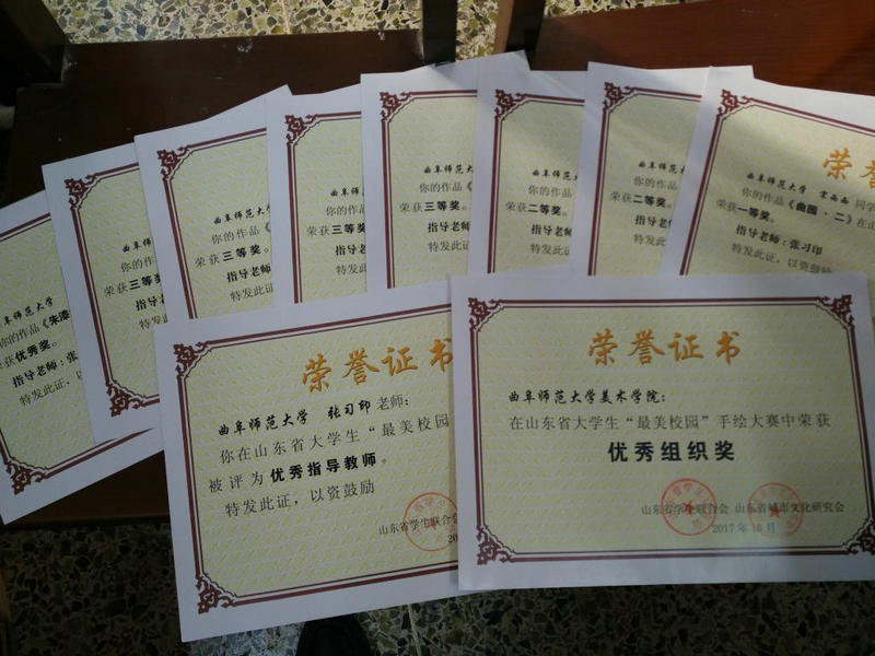 11月23日,由山东省学生联合会、山东省城市文化研究会主办的山东省“最美校园”手绘大赛在济南大学举办,本次大赛共收到中国石油大学、济南大学、开云手机入口、山东建筑大学、青岛科技大学、潍坊学院、内蒙古工业大学(特邀)等十余所高校作品140幅,大赛共评出一等奖5 名,二等奖10名,三等奖20名,优秀奖28名。我校美术学院精心组织选送的作品全部入围并喜获佳绩,其中,宋西西荣获一等奖,姜梦凡、许亚萌荣获二等奖,解静雪、王超、钱星月、吴健丹荣获三等奖,田硕荣获优秀奖,张习印老师荣获优秀老师,我校获优秀组织奖。
