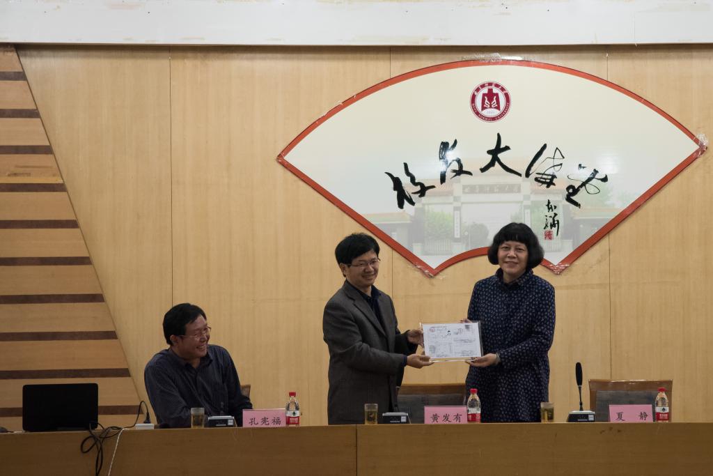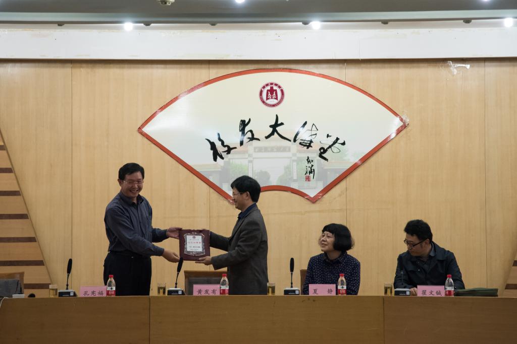 讲座开始前,国内合作处处长孔宪福向黄发有教授颁赠“校友大讲堂”铭牌,文学院院长夏静教授向黄发有教授赠送了他在校时期的成绩单作为纪念。