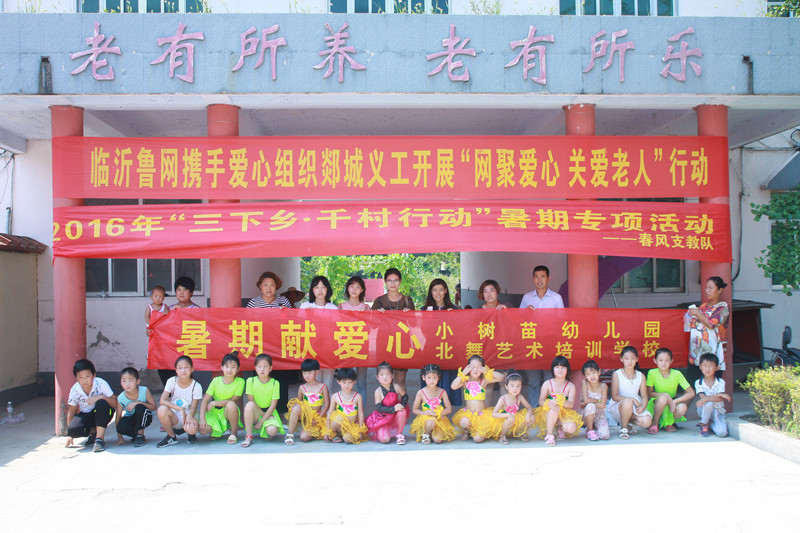8月1日上午,结束了将近两个星期的支教活动,法学院春风支教实践队携小树苗幼儿园和北舞艺术培训学校的孩子们一同到临沂庙山镇敬老院进行了一场慰问演出,为镇上的敬老院送去了“温暖”与“清凉”。