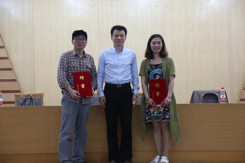 会上,李建胜导演及王斐女士受聘为文学院兼职教授,张隆海为他们颁发了聘书。