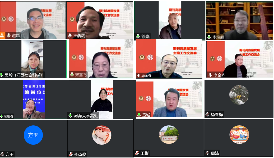曲阜师大期刊中心讯 为提高《齐鲁学刊》办刊质量和水平,更好策划选题,也为更好学习宣传党的二十大精神,实现期刊高质量发展,《齐鲁学刊》编辑部于11月30日举办“期刊高质量发展·主编工作交流会”。《南京大学学报(哲学·人文科学·社会科学)》《东南大学学报(哲学社会科学版)》《湖南师范大学社会科学学报》《江苏社会科学》《南京农业大学学报(社会科学版)》《南通大学学报(社会科学版)》《河海大学学报(哲学社会科学版)》《中国矿业大学学报(社会科学版)》《南京工业大学学报(社会科学版)》等期刊主编和相关负责人应邀参会。会议由《齐鲁学刊》主编赵昆教授主持。