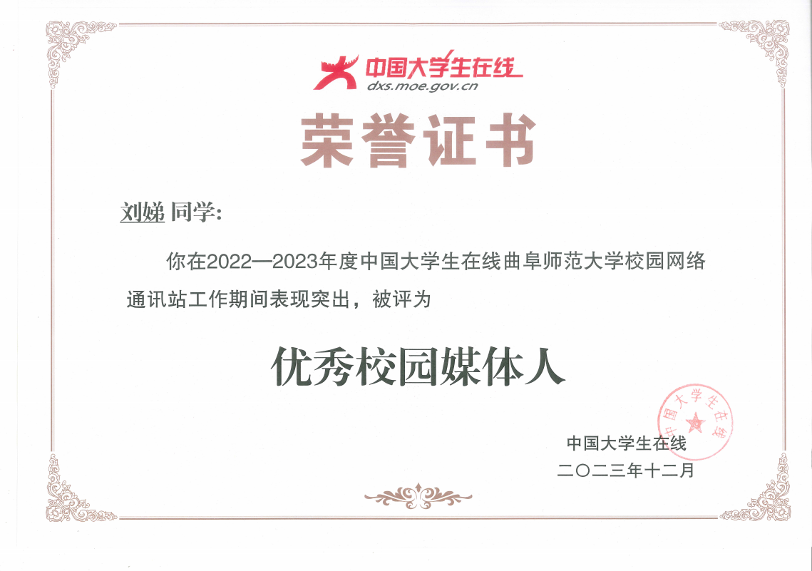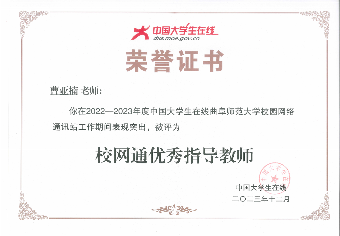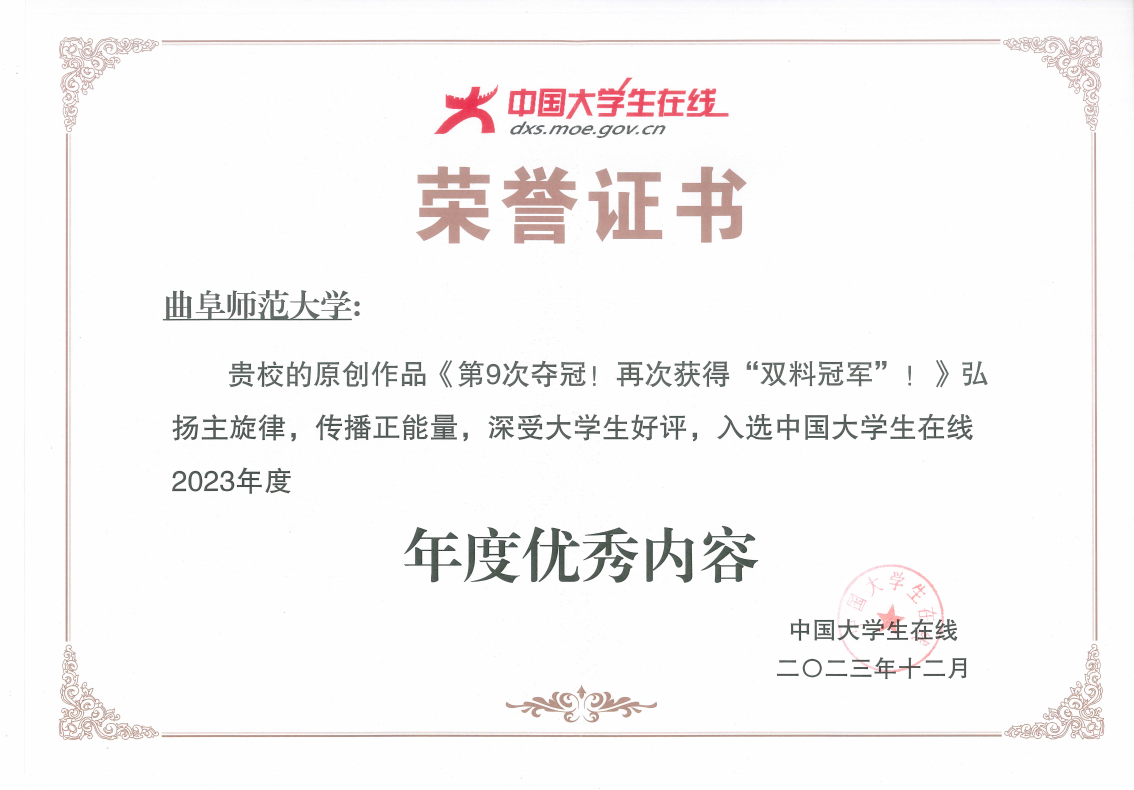曲阜师大学生工作处讯 近日,中国大学生在线平台发布了《中国大学生在线校网通及校园行活动2023年度表彰名单》,曲阜师大获得多项荣誉。曲阜师大中国大学生在线网通站——开云手机入口学工在线获“优秀校网通站”称号,曲阜师大学生工作处获“校园行新星单位”称号,原创作品《第9次夺冠!再次获得“双料冠军”!》获评“年度优秀内容”,学生工作处曹亚楠老师获“校网通优秀指导教师”称号,心理学院学生、曲阜师大中国大学生在线校网通站站长刘娣获“优秀校园媒体人”称号。