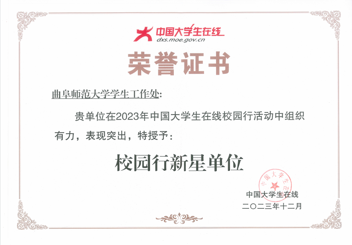 2023年,曲阜师大认真策划组织了“中国大学生在线校园行”活动,6月毕业季到9月迎新季,以“砥砺青春之志,争做时代新人”为主题,先后开展了4个特色活动,包括6月校园行毕业季活动、8月新生网络素养训练营活动、9月中国大学生在线校园迎新活动和新生班级宣讲活动。丰富多彩的“校园行”活动,提升了广大学子的网络素养,提高了学生的综合素质和创新能力,加强了对中国大学生在线的宣传推广,增进了曲园学子对中国大学生在线平台的了解,推动了校园网络文化繁荣发展。