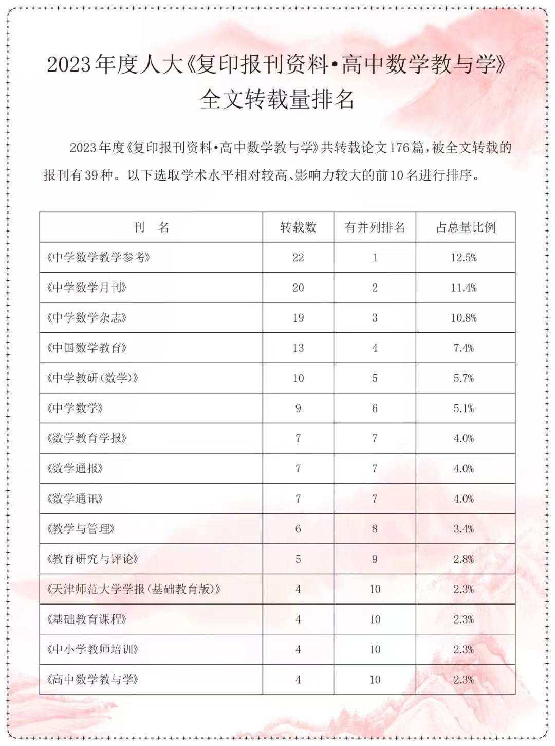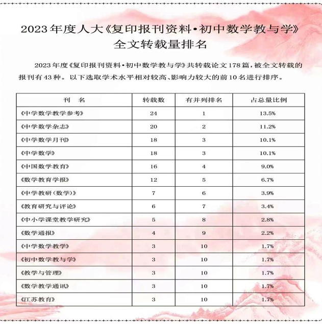 曲阜师大《中学数学杂志》讯 近日,根据中国人民大学书报资料中心全文数据库检索情况,开云手机入口《中学数学杂志》被《复印报刊资料》系列刊(2023年度)全文转载的文章39篇。《复印报刊资料·初中数学教与学》共转载论文178篇,被全文转载的报刊有43种,《中学数学杂志》(初中版)被转载20篇,占总量的11.2%,第2名;《复印报刊资料·高中数学教与学》共转载论文176篇,被全文转载的报刊有39种,《中学数学杂志》(高中版)被转载19篇,占总量的10.8%,排名第3;全年总转载数39篇,第2名;杂志全年总发文数184篇,被转载比全国同类期刊第1。