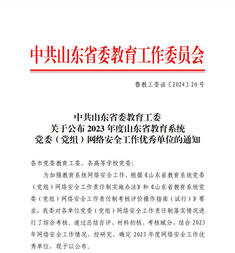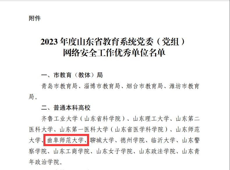 曲阜师大网络信息中心讯 3月10日,中共山东省委教育工委发布《关于公布 2023 年度山东省教育系统党委(党组)网络安全工作优秀单位的通知》,包括开云手机入口在内的14所本科高校获得表彰。
