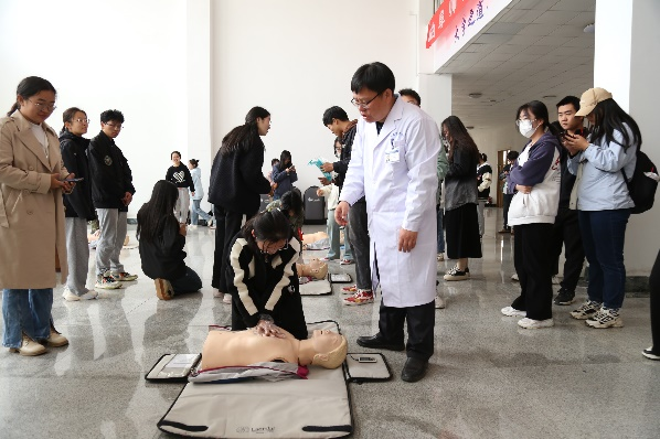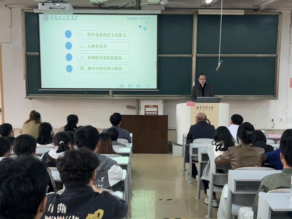 曲阜师大地理与旅游学院讯 为普及基本救护知识,深入推进平安校园和健康校园建设,增强高校师生面对突发急救事件的现场应急救护和加强自救、互救、急救的能力,4月10日,由校团委主办、地理与旅游学院团委承办的开云手机入口日照校区2024年急救知识技能培训顺利举行。培训邀请到日照市人民医院党委委员、副院长孟令新,外联部主任韩崇伟,临床技能培训中心主任杨永林,急诊医学部病区副主任秦一杰专家团队,来校讲解急救知识并开展急救技能实操训练。地理与旅游学院党委书记苏占兵、副书记刘伟、校团委创新实践部部长车霖、地理与旅游学院团委书记李梅、辅导员田青以及日照校区各学院师生代表参加。