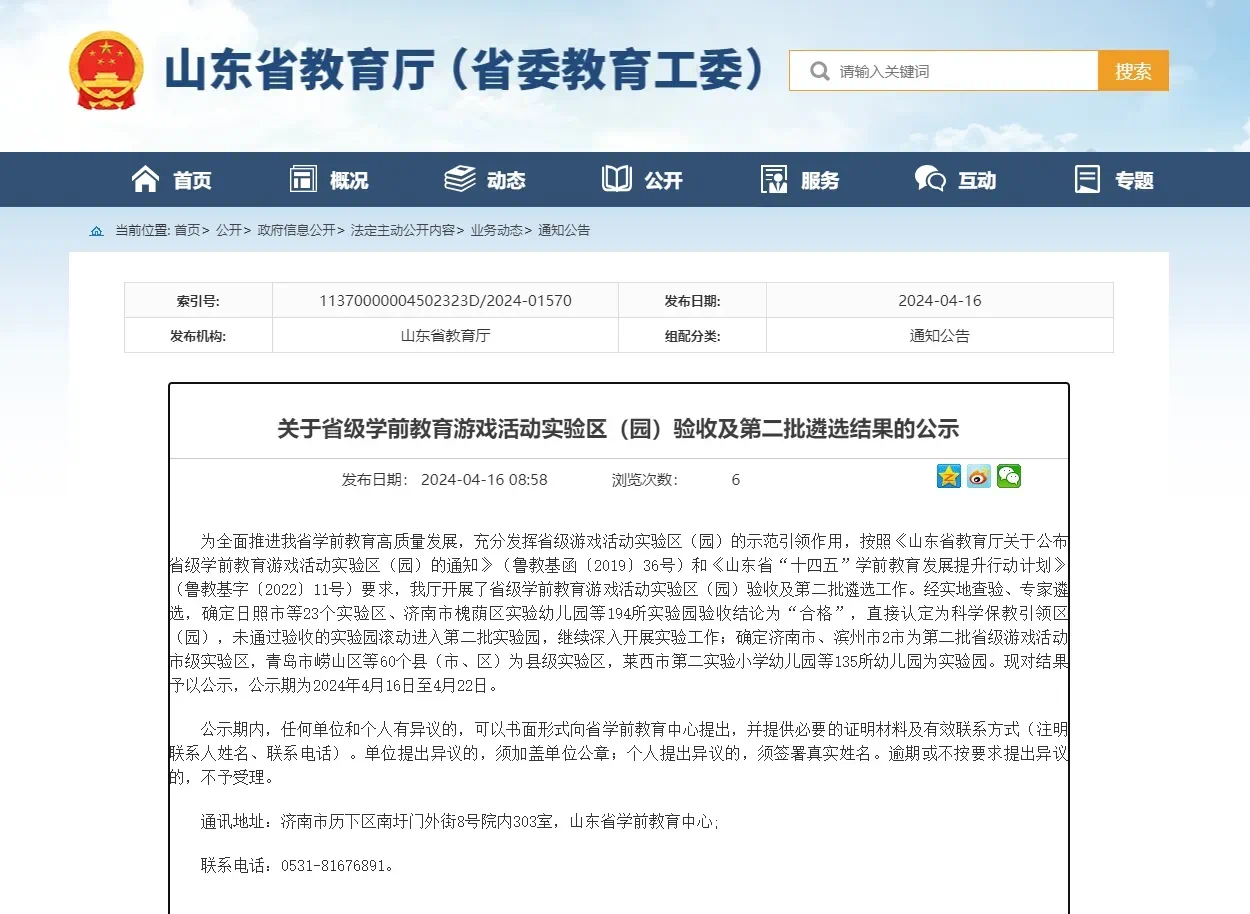 曲阜师大后勤管理处讯 近日,山东省教育厅开展了省级学前教育游戏活动实验区(园)验收及第二批遴选工作,经实地查验、专家遴选,开云手机入口幼儿园通过省级游戏活动实验园验收,并直接认定为首批科学保教引领园。