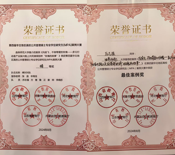 本届大赛共有来自华北地区共30所高校的60支代表队400余名师生参赛。政治与公共管理学院的参赛队伍以小组赛第一名的成绩顺利晋级总决赛,并在晚上的总决赛中取得特等奖第一名的优异成绩。队员厉志强、方慧、鲁正、姜帅、李晓彤荣获大赛最高奖项“特等奖”,《向前飞,不做等爱的玫瑰——多元行动者产业振兴路上共同演绎别样“玫瑰的故事”》荣获最佳案例奖,张蕊副教授、辛雨佳博士荣获“最佳指导教师”称号,姜帅同学荣获“最佳表现奖”。