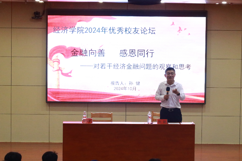 曲阜师大经济学院讯  10月9日下午,经济学院邀请曲阜师大政治系1992级校友、中国民生银行上海分行发展规划部总经理孙健为2024级本科生、研究生作《金融向善 感恩同行——对若干经济金融问题的观察和思考》报告。经济学院李传健、毕文波、王传会、尹凯等老师与2024级研究生、本科生聆听了报告,报告会由经济学院院长李传健主持。