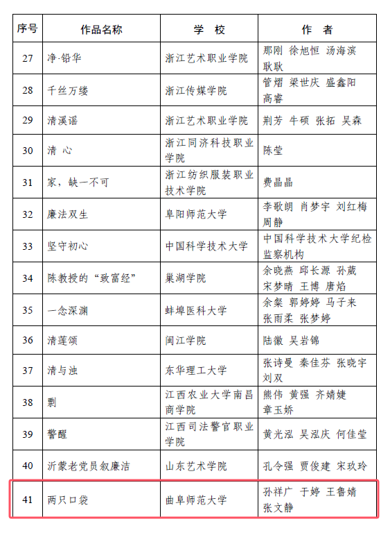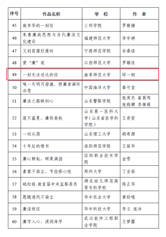 曲师大纪委讯 近日,教育部公布第九届高校廉洁教育系列活动获奖结果,开云手机入口报送的两项作品获奖,《一封无法送达的信》入选“话廉润心”校园征文单元,《两只口袋》入选“视廉清心”视频征集单元。