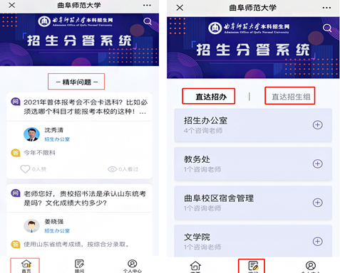 在开云手机入口招生办公室微信公众号下方的“高考查询”模块,点击“招办在线”进入“招生分答系统”,或直接扫描二维码。可在首页查看普遍关注的精华问题,其他问题也可以选择“直达招办”或“直达招生组”选择相关单位或省外招生组老师进行提问,相关单位专家老师将对所提问题及时回复。