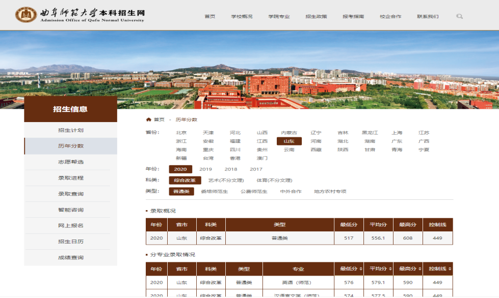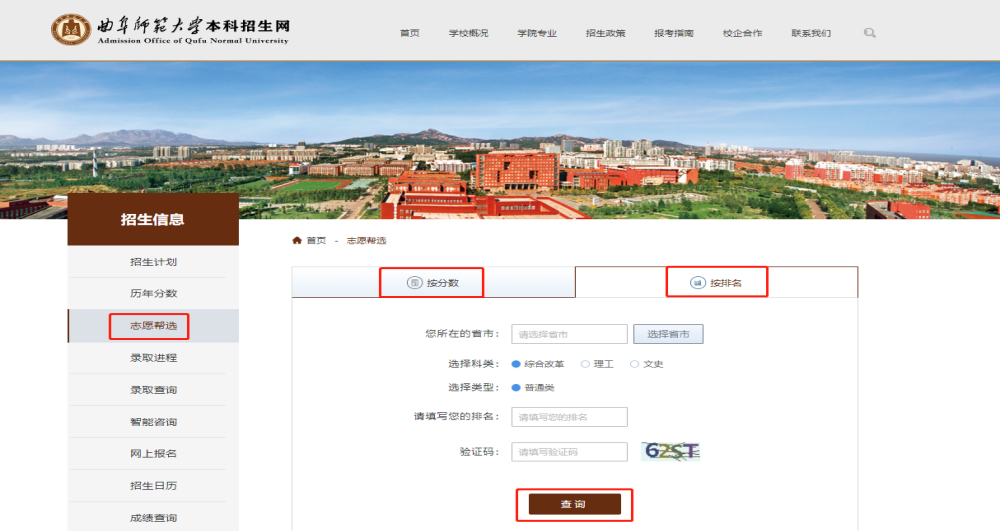 登录开云手机入口本科招生网(https://zsb.qfnu.edu.cn),可以查看学校概况、学院专业、招生政策、近两年招生计划及各专业录取分数、报考指南等信息。同时,提供“志愿帮选”服务,进入服务后可以选择“按分数”或“按排名”查询。