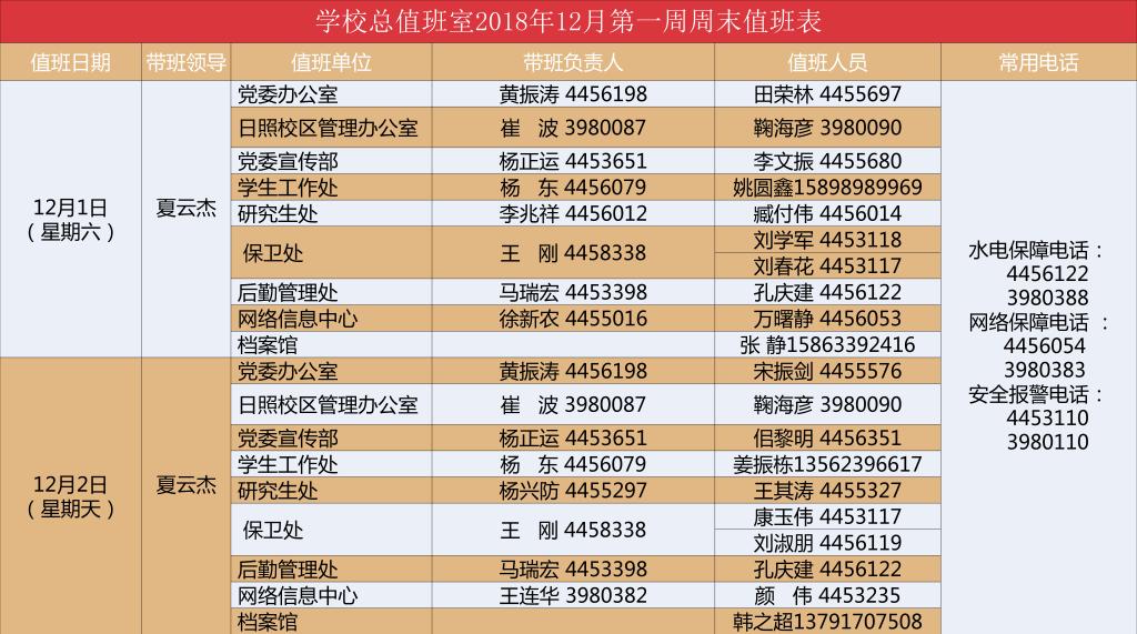 学校总值班室2018年12月第一周周末值班表