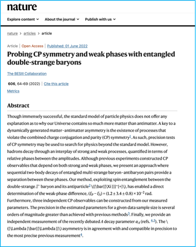 曲阜师大科技处讯(通讯员:武楠)近日,北京谱仪(BESIII)实验完成了世界上最精确的正反科西超子衰变不对称性测量工作,相关成果以“Probing CP symmetry and weak phases with entangled double-strange baryons”为题发表在国际权威学术期刊《自然》(Nature)杂志上。曲阜师大物理工程学院李翠副教授参与该研究并做出重要贡献。(按照BESIII合作组署名规则,文章以BESIII Collaboration署名。)这是曲阜师大研究人员首次在Nature发表学术成果。