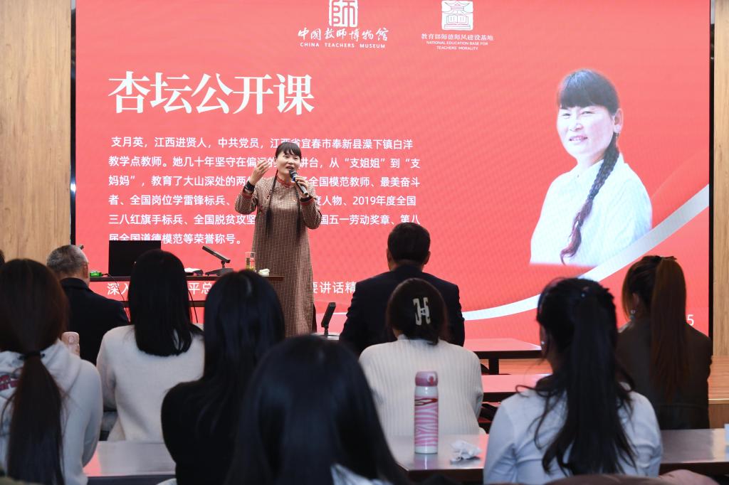 公开课前,教师和师范生代表集体观看了以支月英为原型的电影《一生只为一事来》,了解支老师“一生只为一事来”的感人事迹,感悟“一颗丹心献讲台”的赤诚情怀。观影结束后,教师博物馆讲解员为支月英老师献上了诗朗诵,向她致敬。