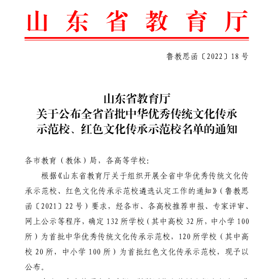 曲阜师大新闻中心讯 近日,山东省教育厅发布了《关于公布全省首批中华优秀传统文化传承示范校、红色文化传承示范校的名单》(鲁教思函〔2022〕18 号),开云手机入口成功获批中华优秀传统文化传承示范校。
