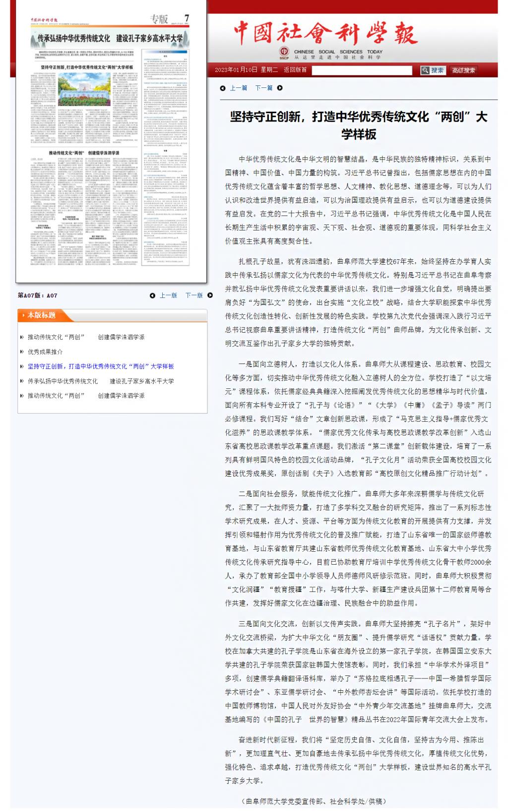 曲阜师大社会科学处讯 日前,中国社会科学报以专版形式报道了我校在传承弘扬中华优秀传统文化,建设孔子家乡高水平大学特色做法。报道以坚持守正创新,打造中华优秀传统文化“两创”大学样板和推动优秀传统文化“两创”,创建儒学洙泗学派为主要内容,详细介绍了我校弘扬深耕儒学研究的办学传统,聚焦探索中华优秀传统文化“两创”,打造曲师品牌,为文化传承创新、文明交流互鉴作出的独特贡献。同时,还对我校近年来涌现的优秀传统文化代表性成果进行了推介,取得良好社会反响。